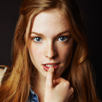 The image features a young woman with red hair, looking at the camera with a slight smile. She appears to be in an indoor setting with soft lighting that highlights her features.
