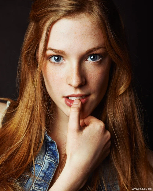 На снимке изображена молодая женщина с рыжими волосами, которая смотрит на камеру с легкой улыбкой. Она, кажется, находится в помещении с мягким освещением, которое подчеркивает ее особенности.