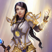 dark hair and is wearing armor with a design that suggests she may be a warrior or an adventurer. Her attire includes a chest piece adorned with a star and crescent symbol, which could represent her affiliation or status within the context of