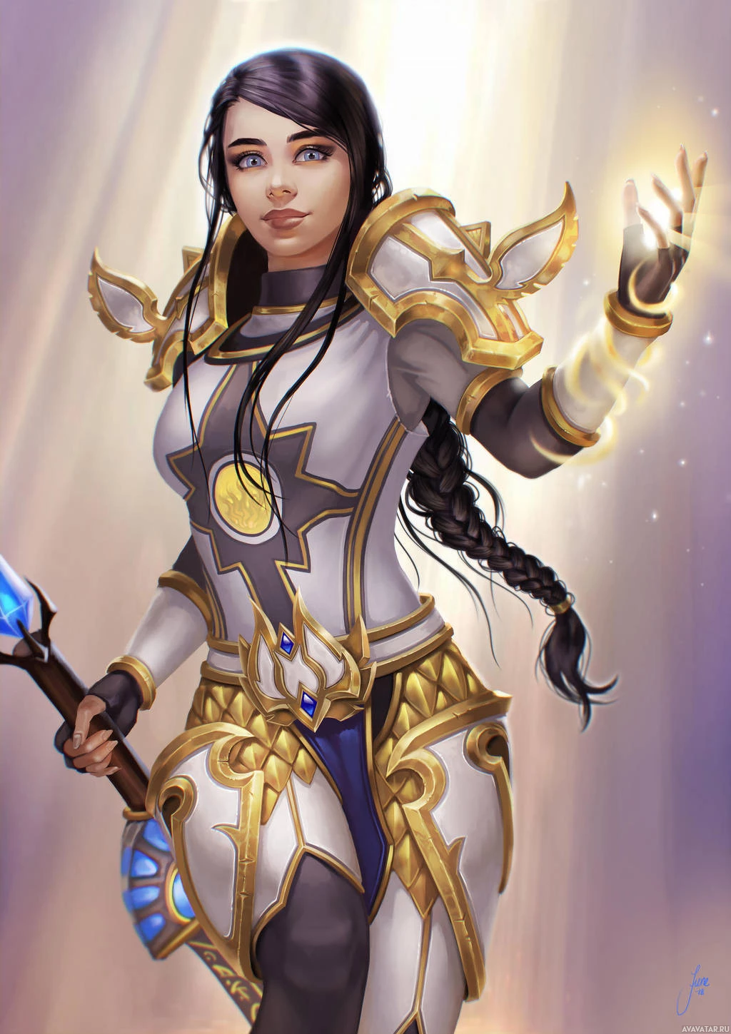 the fantasy world she inhabits. The character is holding a staff in one hand and appears to have