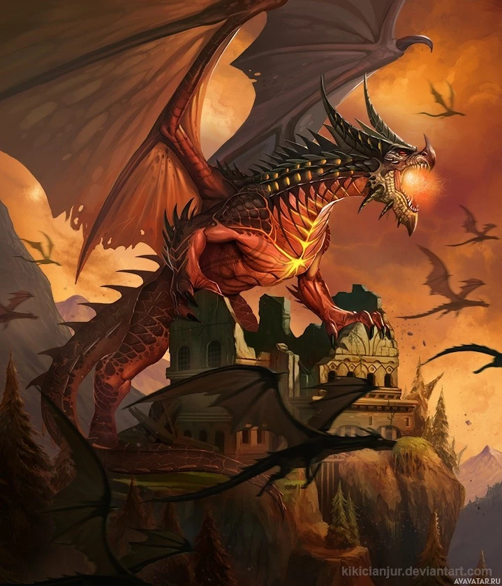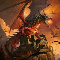 На картинке изображен фантастический дракон, стоящий на скале с видом на замок или крепость. Дракон имеет большие крылья, шипы бегут вдоль спины, и изображен с агрессивной осанкой, возможно, в разгар нападения. Похоже, что в нем зажигается какой-то волшебный огонь, который способствует драматической атмосфере сцены.