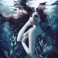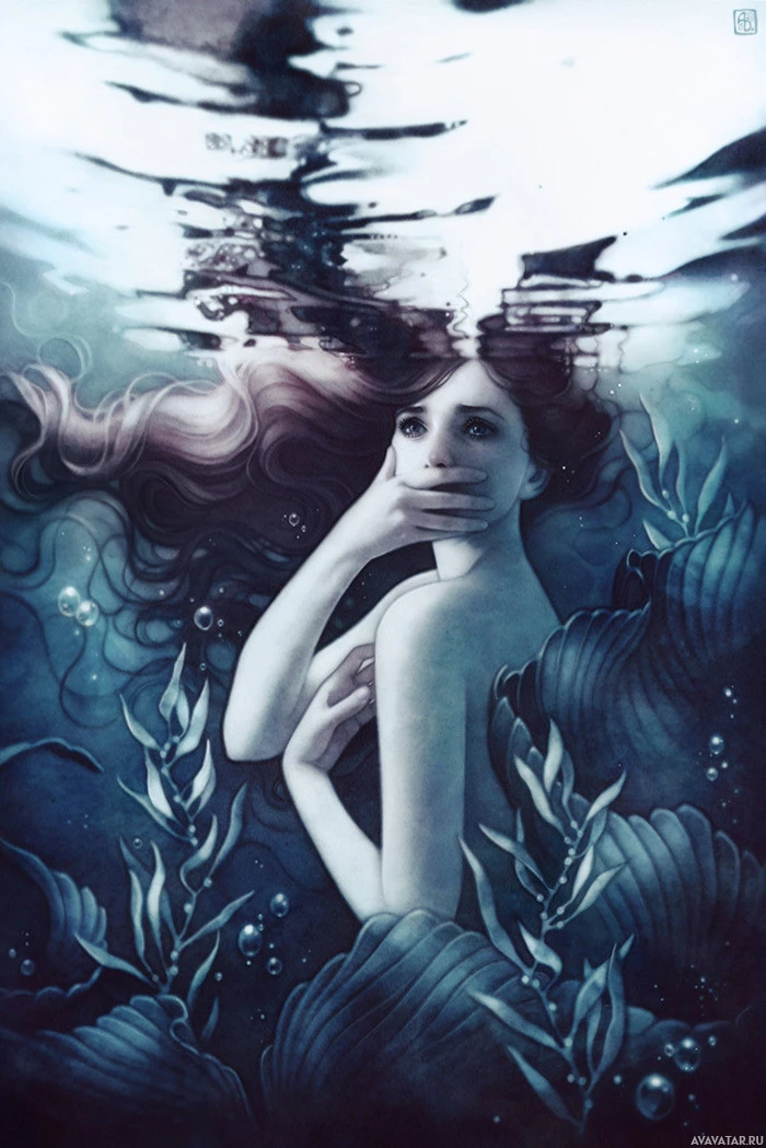 На картинке изображена русалка с человеческими характеристиками, сидящая под водой среди водных растений. Персонаж имеет длинные волосы и, кажется, находится в состоянии созерцания или, возможно, печали, учитывая закрытые глаза и взгляд вниз. Произведение имеет фантастическую тему и, вероятно, призвано вызвать эфирную, потустороннюю атмосферу.