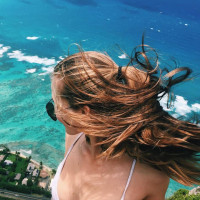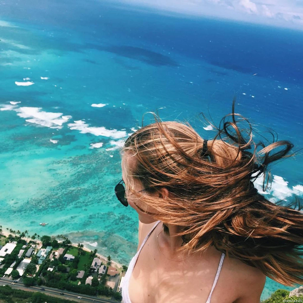 The image shows a person standing on a high vantage point, possibly overlooking the ocean. The individual appears to be wearing sunglasses and is looking out at the expansive sea beneath them. It seems like they might be enjoying a beautiful view or experiencing a moment of relaxation amidst nature's splendor.