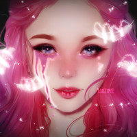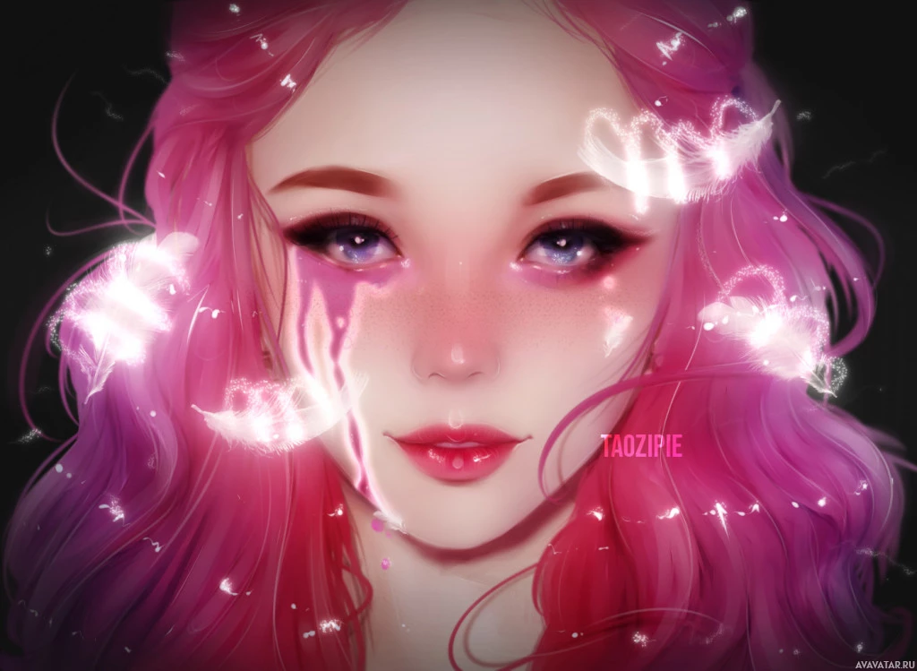 pink hair. Her makeup is quite dramatic, featuring darkened eyes and what appears to be blood dripping down her face from one eye, giving it a striking,