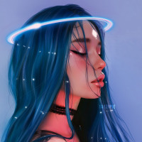 На картинке изображена стилизованная иллюстрация девушки с синими волосами. У нее ореолообразное свечение вокруг головы и, кажется, она смотрит в сторону с созерцательным выражением. Есть тонкие световые эффекты, окружающие ее, предлагая эфирную или потустороннюю тему.