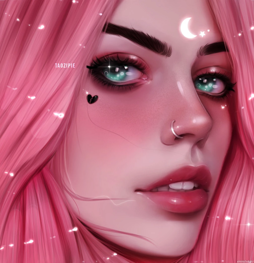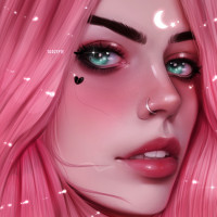 pink hair, styled in a modern and edgy fashion. She has visible eyelashes and blue eyeshadow that gives her