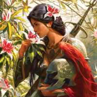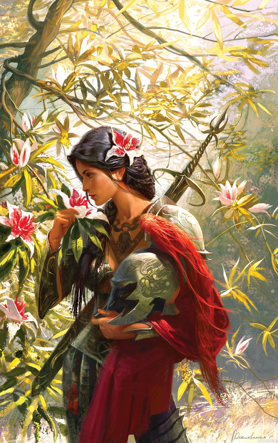 The image depicts a character who appears to be female, dressed in what looks like historical or