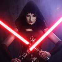 a female character dressed in a costume that resembles the attire of a Sith Lord from the "Star Wars" franchise. She is holding two red lightsabers crossed in front of her, which are