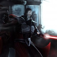 the Star Wars franchise. The individual is dressed in what appears to be an armor and cape, with a helmet featuring a mask or visor. They are holding