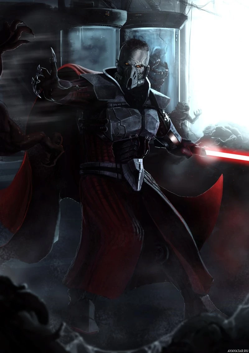 a red lightsaber, which is iconic within the Star Wars universe. In the background, there seems to be