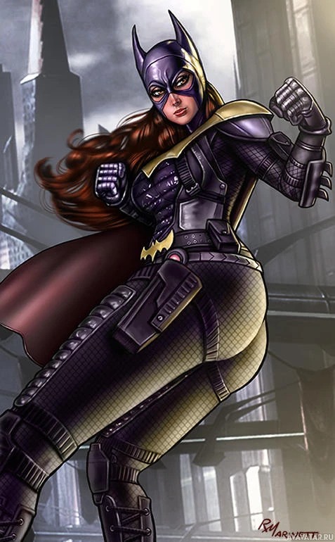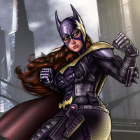 a female character dressed as Batgirl, standing in an urban setting that appears to be inspired by the Gotham City from the "Batman" series of comics and movies. She is wearing a suit with the iconic Batgirl logo on her chest and has her hair styled in a way that suggests she is actively engaged in combat or action. The background features elements like a chain-