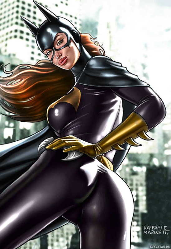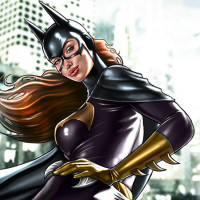 a female character dressed as Batgirl, standing in a dynamic pose that suggests she is ready for action. She is wearing the iconic black and yellow outfit with bat-themed elements, such as the cowl and gloves. The background appears to be