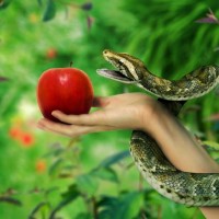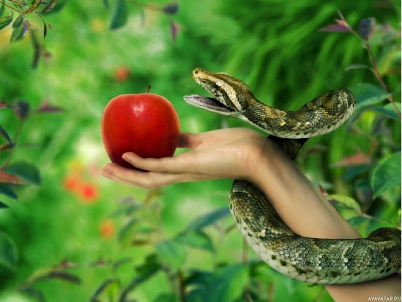 The image depicts a hand holding an apple in front of a snake. The snake is positioned as if it's reaching out towards the apple with its mouth open, possibly in an attempt to bite or take the apple from the person's hand. The background appears to be lush and green, suggesting