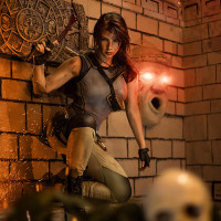 The image features a person dressed in cosplay, portraying the character of Lara Croft from