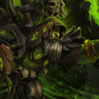 combat gear, with the central character wielding a staff or wand. The background features a greenish-yellow tint, possibly indicating some sort of magical or poisonous environment within the game's