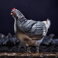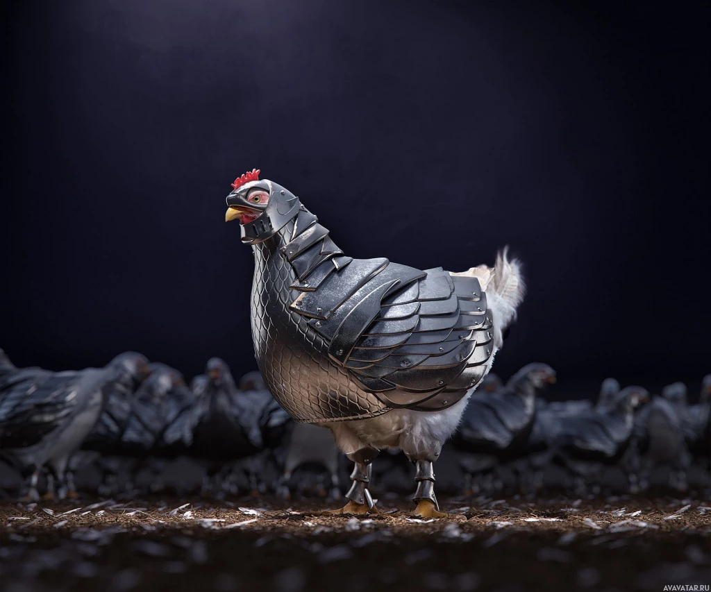 The picture shows a single chicken that has been creatively altered to resemble a knight in armor, complete with a breastplate and helmet. This chicken is surrounded by a multitude of real, ordinary-looking chickens, which are scattered around the central figure, creating an amusing and whimsical scene. The setting appears to be a barn or similar