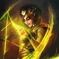 mystical abilities or powers. The background has a dark, possibly magical ambiance with light effects that could represent