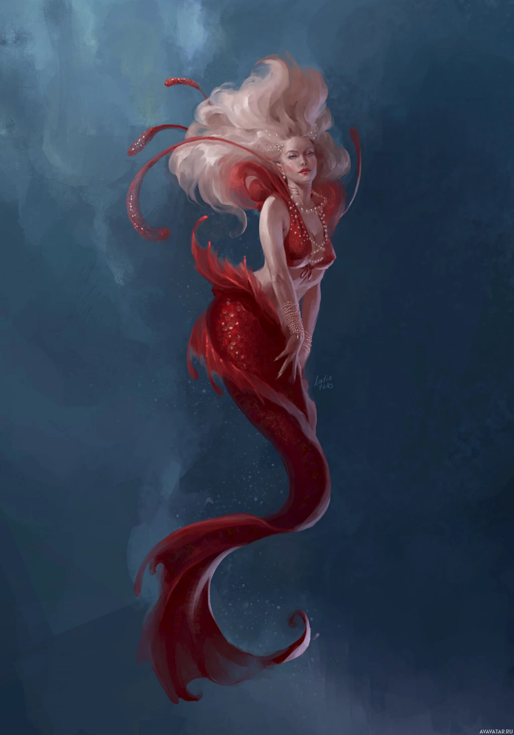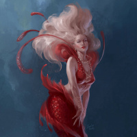 mermaid tail, with scales that are also colored red or pink. The background suggests