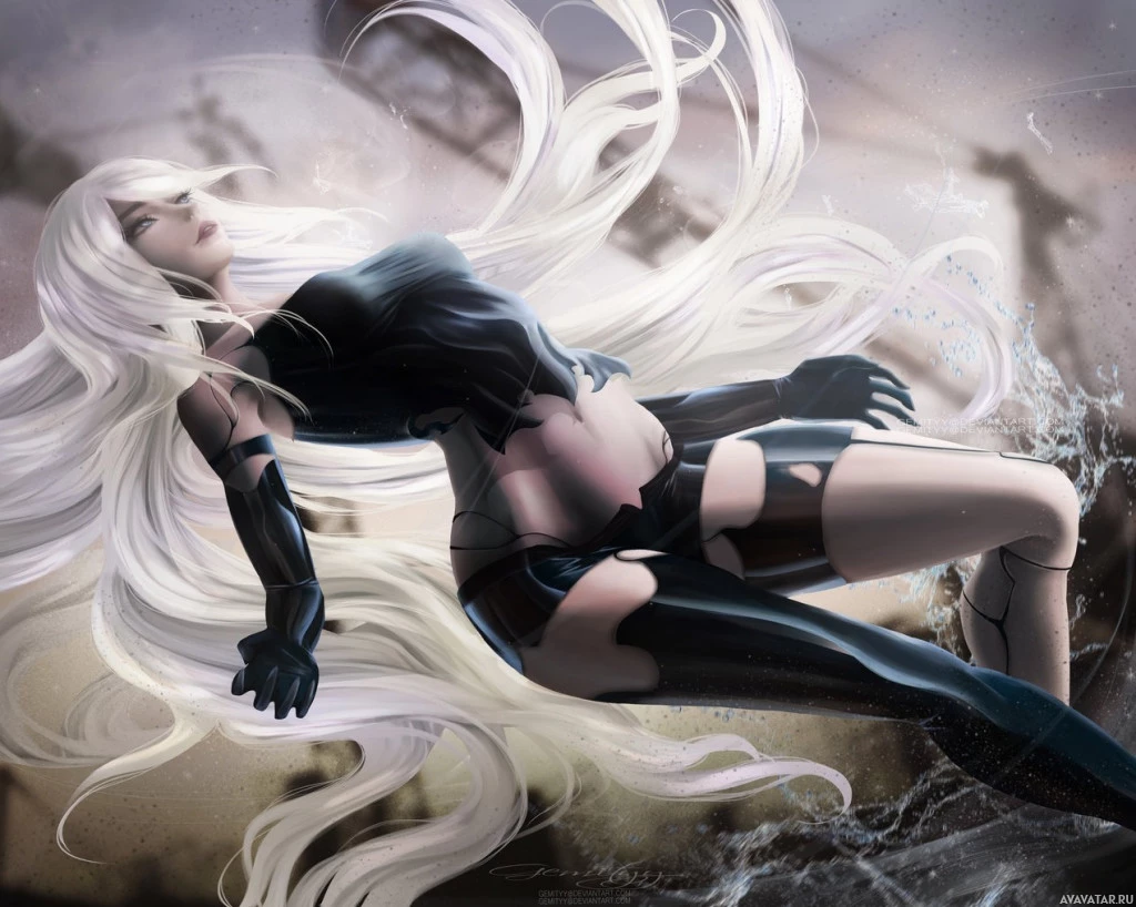 white hair and a black outfit, sitting on the ground. The character appears to be in a contemplative or defeated pose, as indicated by her