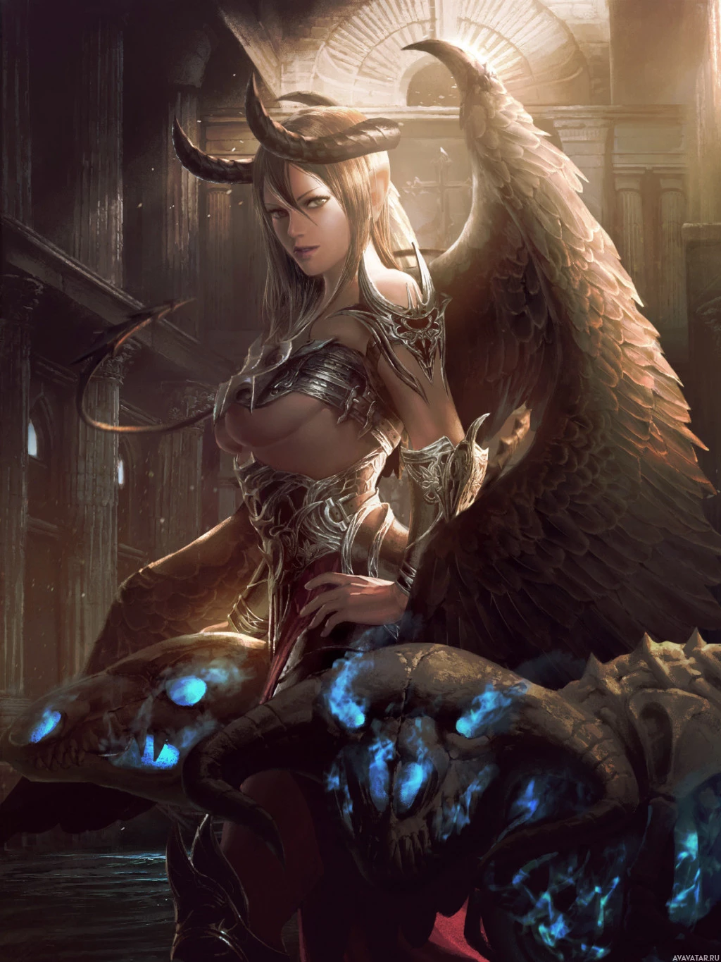 a female character with a demonic appearance. She has horns and wings, suggesting she might be an angel or a devil-like figure. The character is wearing armor and holding a staff, indicating that she might be a warrior or a mage in this