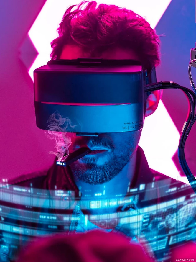 reality headset. They are smoking, and the environment appears to be dimly lit with a colorful