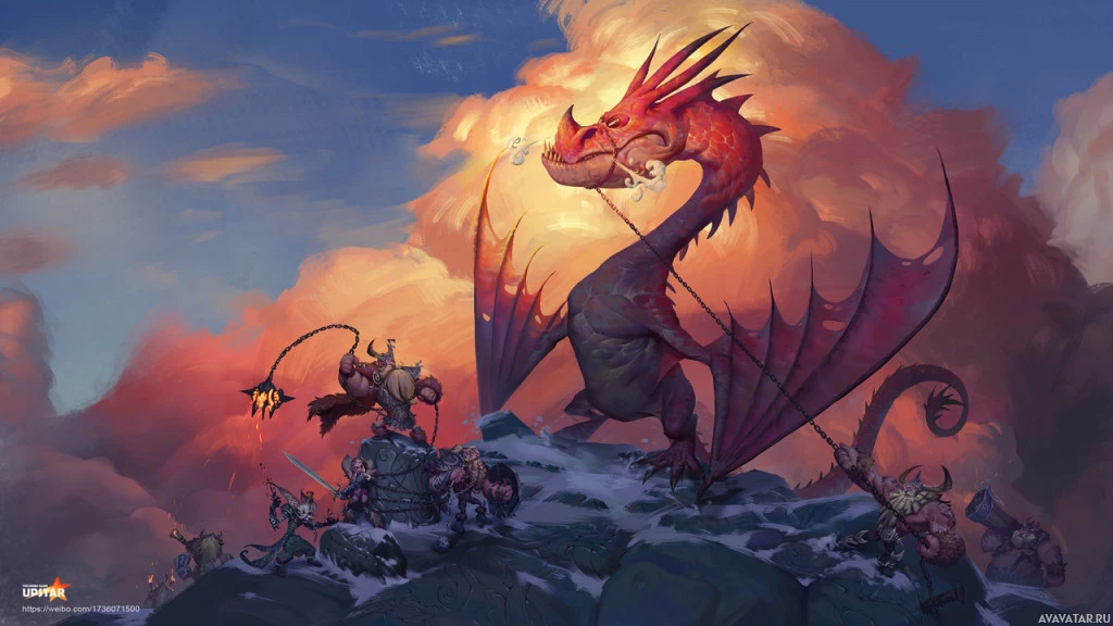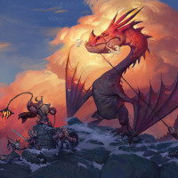humanoid creatures that appear to be engaged in combat or confrontation against the larger dragon. The setting is outdoors under