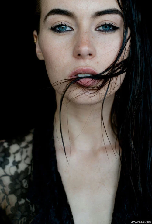 blue eyes and her expression is somewhat intense or contemplative. Her hand is near her face, suggesting she might be touching her cheek or nose, which adds to