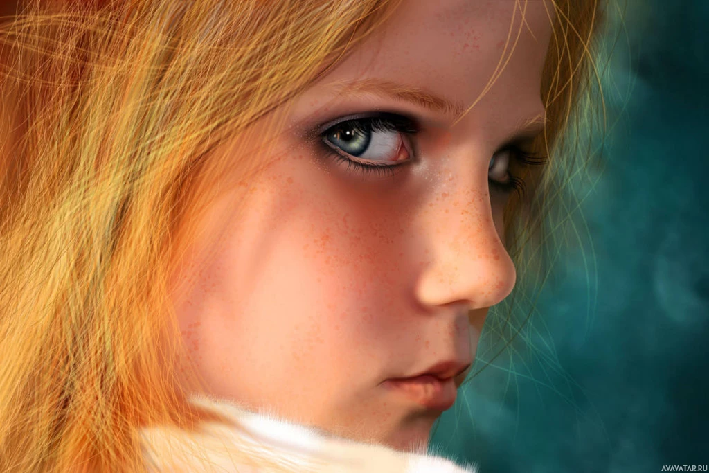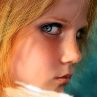 red hair. Her gaze is directed to the side, giving her a thoughtful or contemplative expression. She appears to be looking at something beyond the frame of the image. The background has a dark or moody tone, which contrasts with her bright hair color.