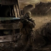 a sniper rifle, suggesting they might be a military personnel or part of a specialized team. The overall atmosphere suggests chaos and conflict.