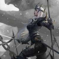 blonde hair, wearing what appears to be armor or battle attire, suggesting that she might be a warrior or fighter in the context of her story. In one hand, she holds a sword, and in the other, she wields a shield, which are typical weapons for such characters in