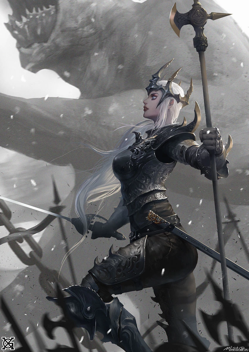 a monstrous creature in the background, contributing to the fantastical theme of the artwork.