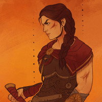 an illustrated character who appears to be a warrior or a heroine from the Assassin's Creed series. She is depicted with