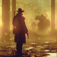 long coat, which might suggest that the setting is in a historical context. They are holding a pistol, indicating they might be involved in some form of conflict or action-related scenario. In the background, there are two other figures; one is on horseback, wearing similar attire to the standing figure, and the other seems to be operating machinery that could be a steam-powered vehicle or an early-