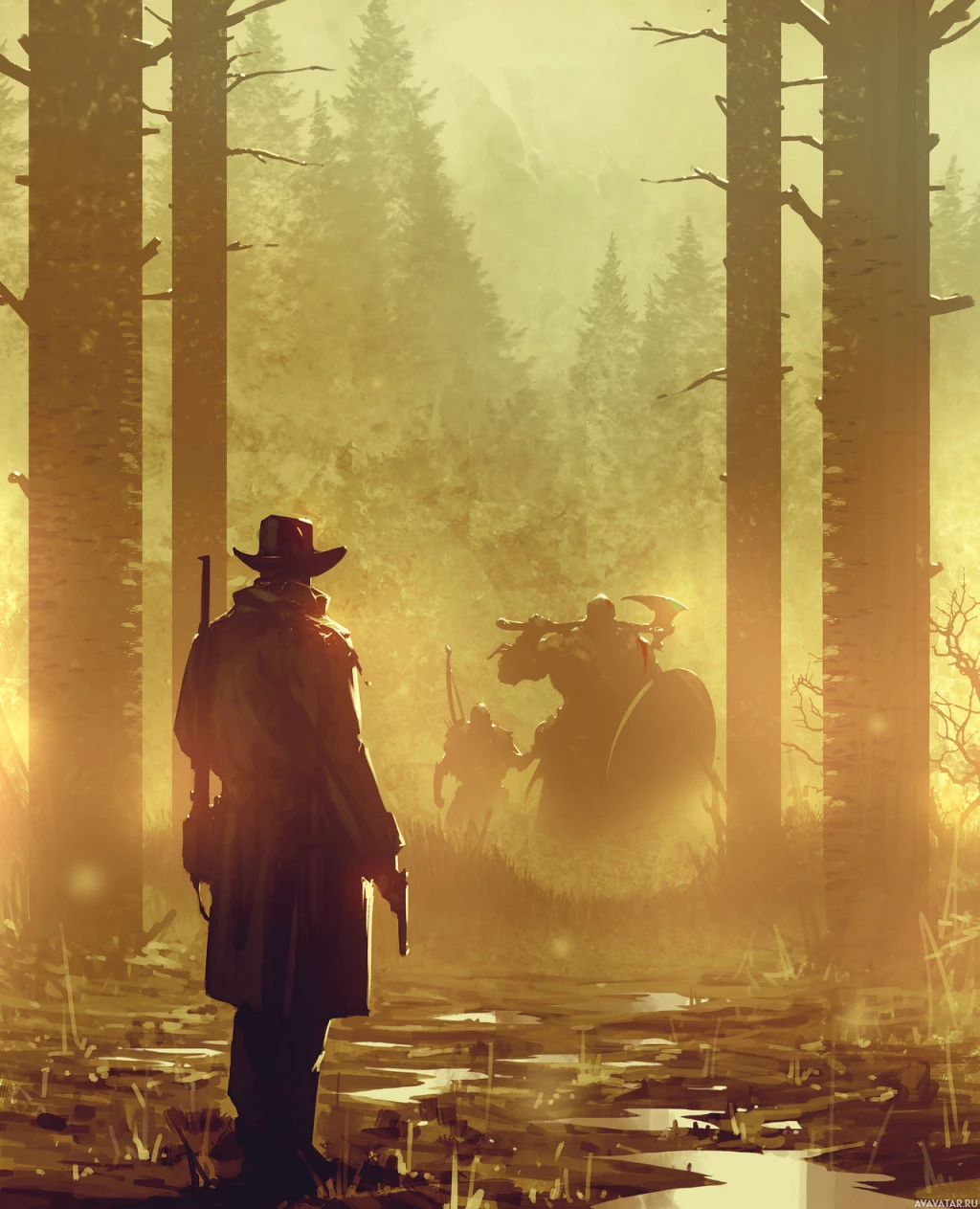 forest scene. This individual is dressed in period clothing, including a hat and what appears to be a trench coat or