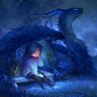 blue hair. In front of him, there's a dragon-like creature made out of vines or flowers, giving the impression of an ethereal and magical being. The dragon-like plant wraps around the boy's legs. The setting appears to be