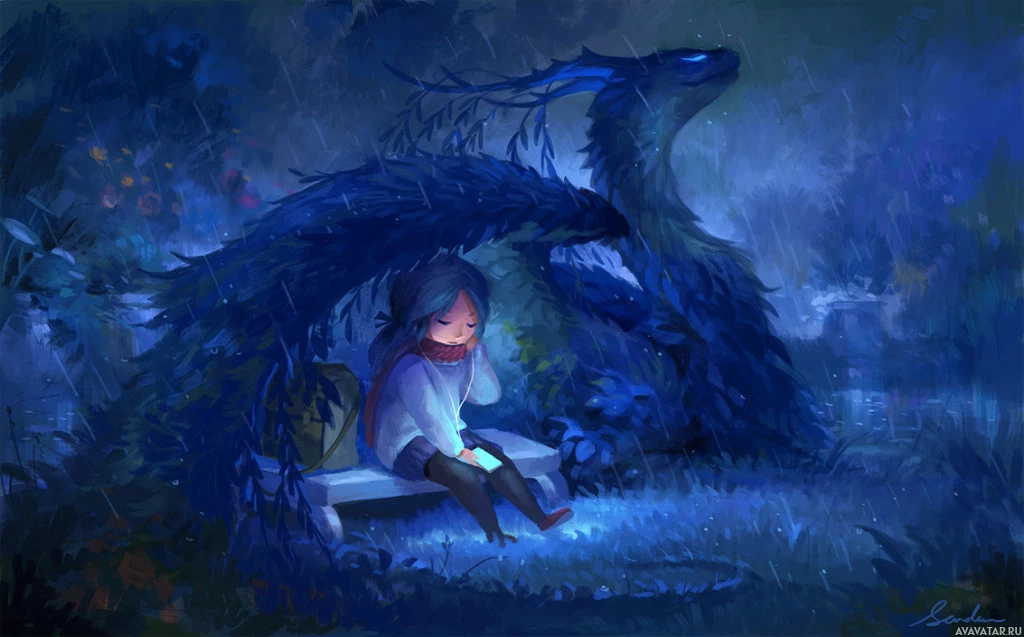 a dark forest at night, with rain pouring down, as evidenced by the wet ground and the droplets visible in the air. There is also a phone lying on the bench beside him, suggesting he may have been using it before the scene began. Overall, this image is rich in fantasy elements that create