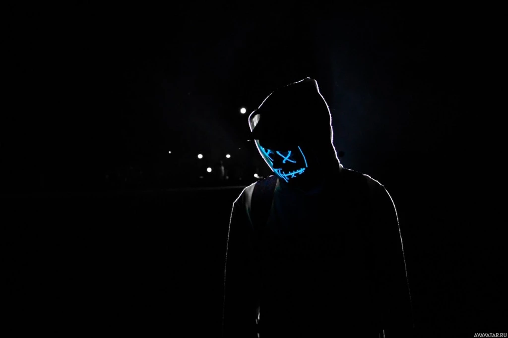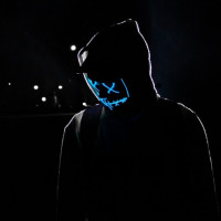 The image shows a person wearing a hood and a mask. The hood appears to be part of a dark-colored jacket or top, while the mask obscures the person's face, leaving only their eyes visible. It seems like the individual is standing in a dimly