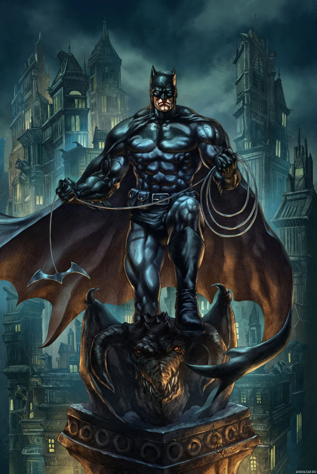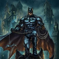 book character. In the background, there are gothic architectural elements that suggest a setting similar to Batman's fictional