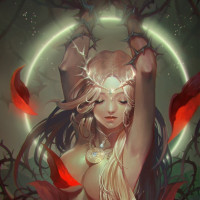 forest setting, possibly a place of power or enchantment. The character exudes an ethereal and otherworldly aura, fitting the description of "girl" and "blonde."