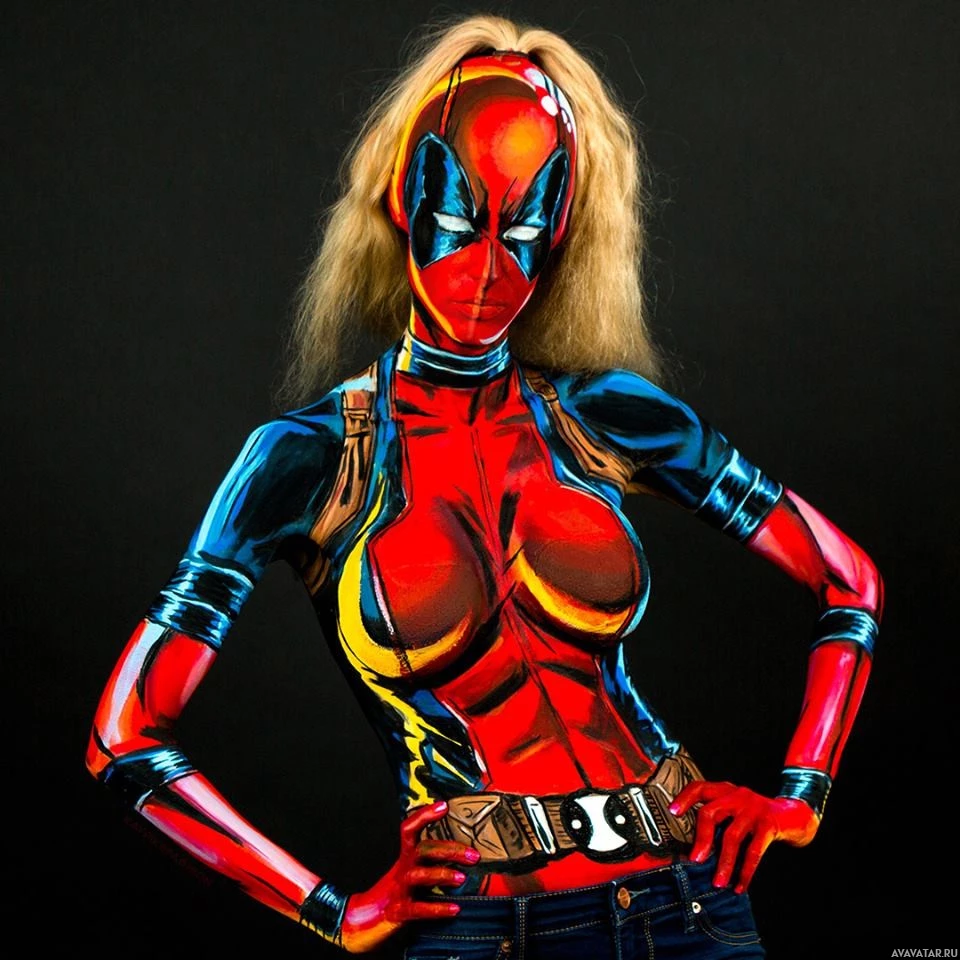 This is an image of a person who has had their body painted to resemble the character Deadpool from