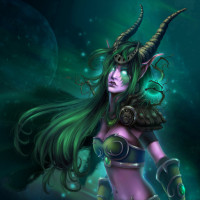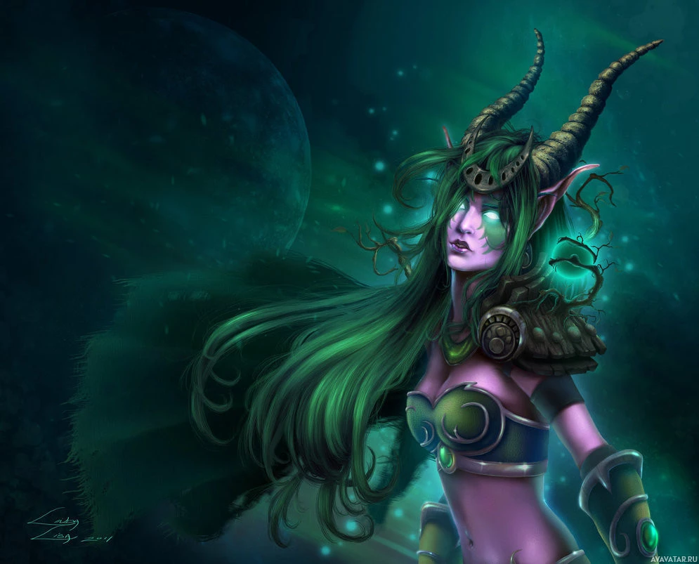 an ornate mask or helmet with horns on top, suggesting she might have a role related to combat or leadership within her faction. The art style suggests it could be fan art or