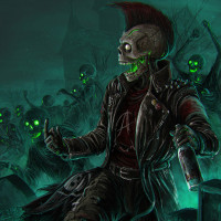 an electric guitar, suggesting they might be a member of a band or involved in some form of musical performance. The background has a dark, gothic ambiance with greenish-