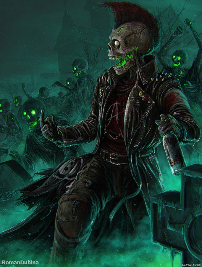The image depicts a fantasy-themed illustration featuring a character resembling a skeleton. The character is dressed in