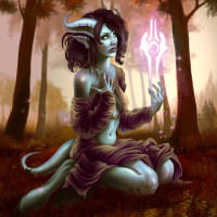 natural setting. Her attire and the style of her hair suggest a mystical or enchanted theme. In her hand, she holds what looks like