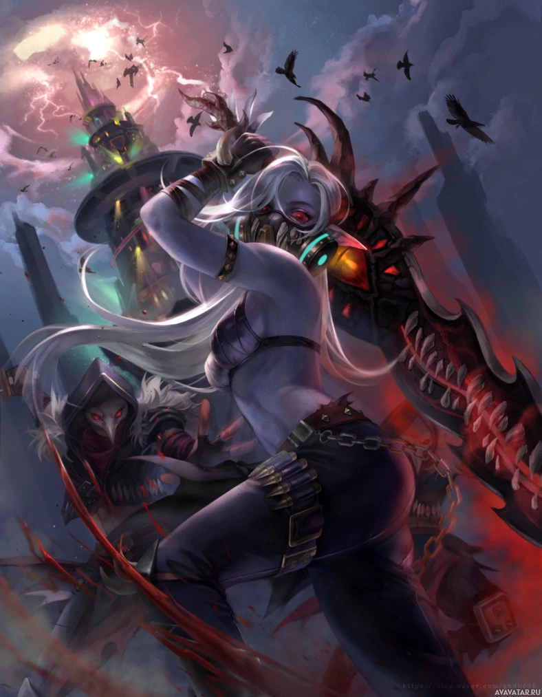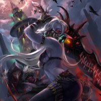 The image depicts a fantasy-themed scene featuring characters that appear to be from the game "Dota 2," which is a multiplayer online battle arena (MOBA)