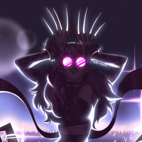 vibrant colors. The character seems to have a confident or energetic posture, as she is striking a pose with her hands raised above her head. There's a futuristic or cyber-punk vibe to the style of the artwork.