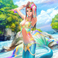 fish scales, which adds to the fantasy element of the image. The background suggests an idyllic