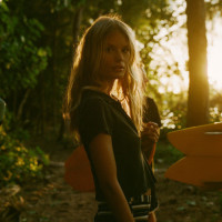 На снимке изображена молодая женщина со светлыми волосами, стоящая в лесу. Она одета небрежно и, кажется, несет некоторые предметы, которые предполагают, что она может участвовать в мероприятиях на свежем воздухе, возможно, связанных с водными видами спорта, учитывая объект, похожий на доску для серфинга, который у нее есть рядом с ее талией. Солнечный свет, фильтрующий деревья, создает теплую атмосферу, улучшая естественную настройку фотографии.