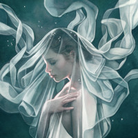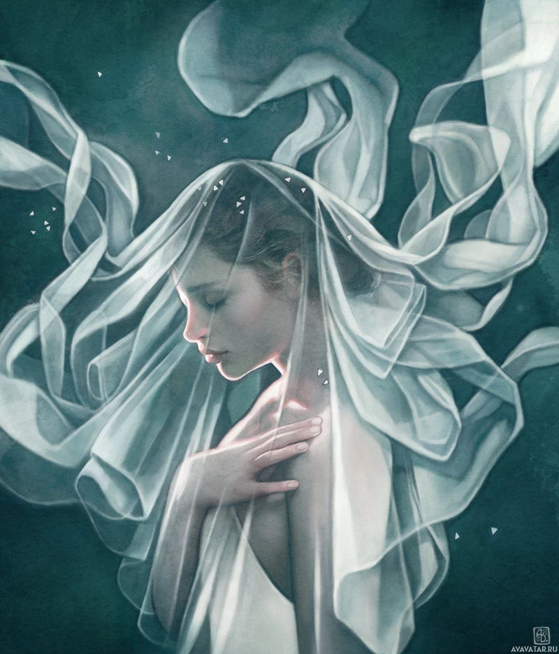 flowing hair and is adorned with what could be mist or a light, ethereal substance that seems to surround her head and neck like a ghostly cloak. The background is dark, which contrasts with the luminous quality of the surrounding element. This artwork might suggest themes of love, marriage, spirituality, or fantasy.