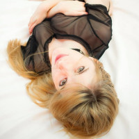 The image shows a woman lying on her back on what appears to be a bed with white linens. She has blonde hair and is wearing an outfit that resembles lingerie or underwear. Her body is positioned in such a way that she is slightly arched, and her legs are bent at the knees. The lighting is soft, which creates a relaxed and intimate atmosphere.